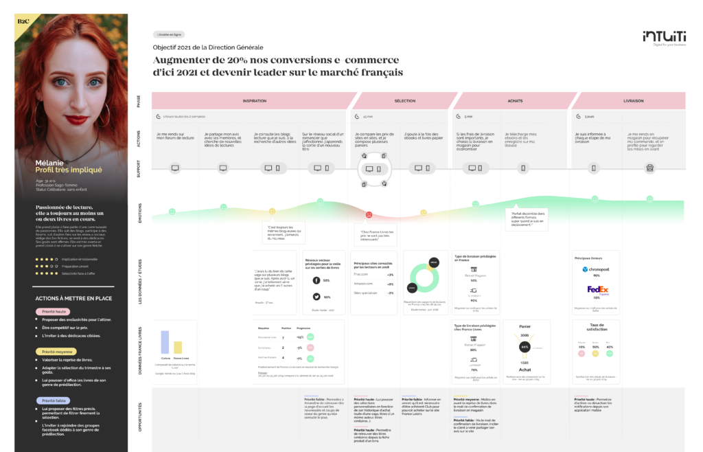 Cas pratique : Chez Intuiti, chaque construction de Customer Journey débute par l’écoute des cibles (clients, prospects, utilisateurs). Par exemple, lors d’une étude pour un acteur de la distribution de livres, des clients et prospects nous ont raconté leur parcours, leurs habitudes et leurs besoins lors de 3 sessions de focus groups (+ d’infos sur les focus groups à ce lien). Ces sessions de rencontre avec les utilisateurs de la marque nous ont permis de comprendre leurs visions du rôle du magasin vs. celui du web, et comment, quand et pourquoi ils passent de l’un à l’autre.