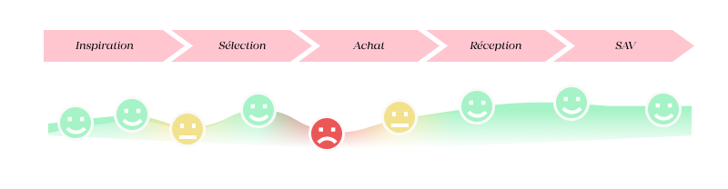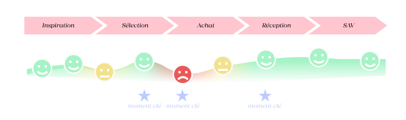 Représenter les émotions ressenties par l’utilisateur à chaque action de son parcours pousse à se mettre en empathie avec lui et permet d’identifier en un coup d’oeil les moments qui aujourd’hui se passent bien (à conserver) ou se passent moins bien (sur lesquels il faudra agir en priorité). Ajouter des verbatims permet d’illustrer ces émotions, et de mieux comprendre la perception de l’utilisateur.