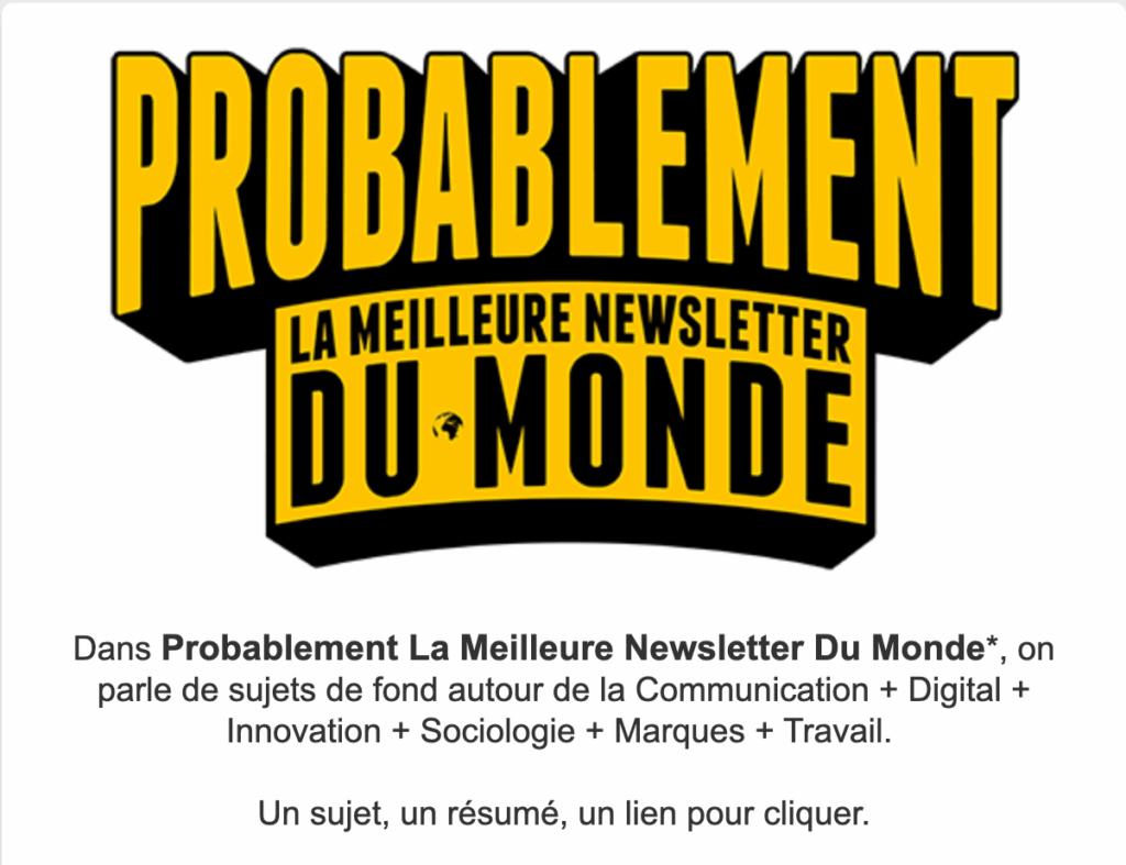Probablement La Meilleure Newsletter du Monde vous parle de communication, de digital, d’innovation, ou encore de sociologie, de marques et d’organisation du travail. Newsletter qui sort de l’ordinaire de l’analyse publicitaire et qui voit beaucoup, beaucoup, plus large.