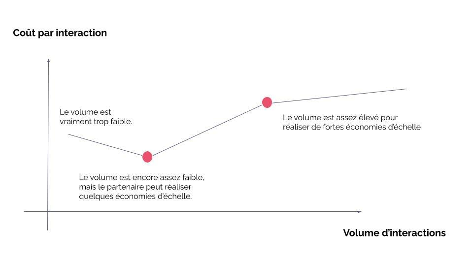 - Un premier point en dessous duquel la prestation (rapportée au nombre d’interactions) peut coûter cher. À partir de ce point, qui est très variable selon les prestataires, le volume est encore assez faible, mais le partenaire peut réaliser quelques économies d’échelle et donc réduire le coût au nombre d’interactions.