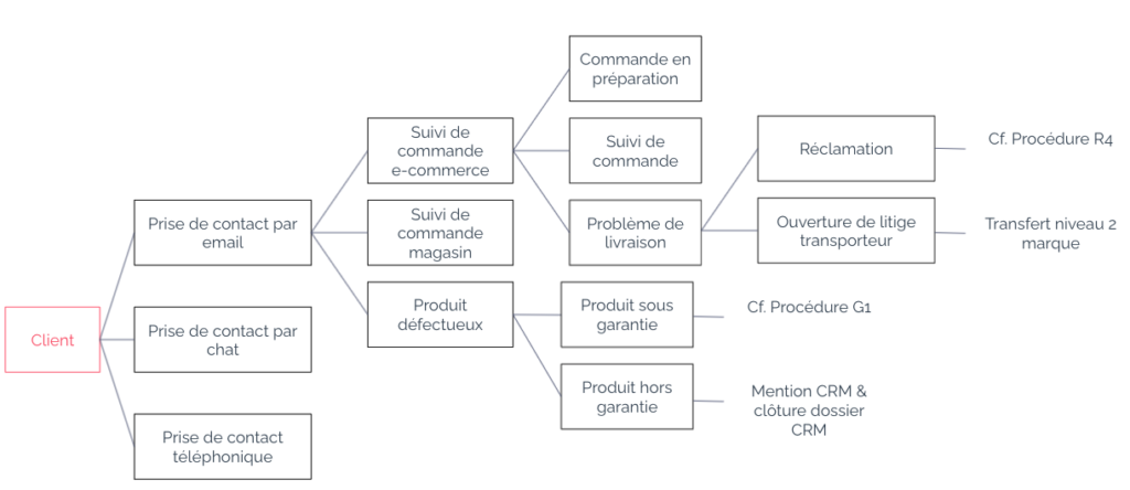 L’arbre de décisions n’a pas besoin d’être particulièrement complexe. Bien au contraire, plus il sera simple, plus votre client sera traité avec fluidité. Vous pouvez réaliser cet arbre seul, ou avec l’aide de votre partenaire. il peut aboutir vers une gestion à 100% par votre partenaire, ou à un transfert. Dans tous les cas, il permet de parfaitement définir les missions et les responsabilités de chacun. Et, lors des réunions de suivi, de tout de suite identifier les problèmes et solutions à apporter.