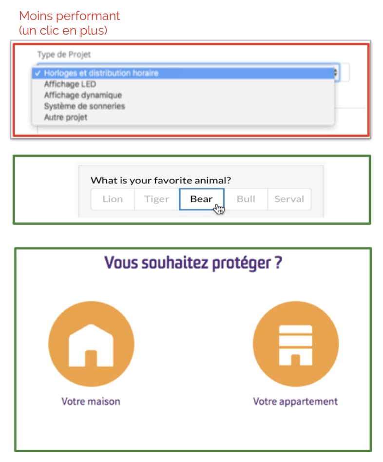 L’économie de clic: une liste déroulante oblige à utiliser un clic en plus (ouvrir la liste puis choisir l’une des entrées). Si le nombre d’entrées d’une liste déroulante est inférieur à 5 ou 6, nous conseillons d’afficher ces entrées de base (voir l’illustration ci-dessous).