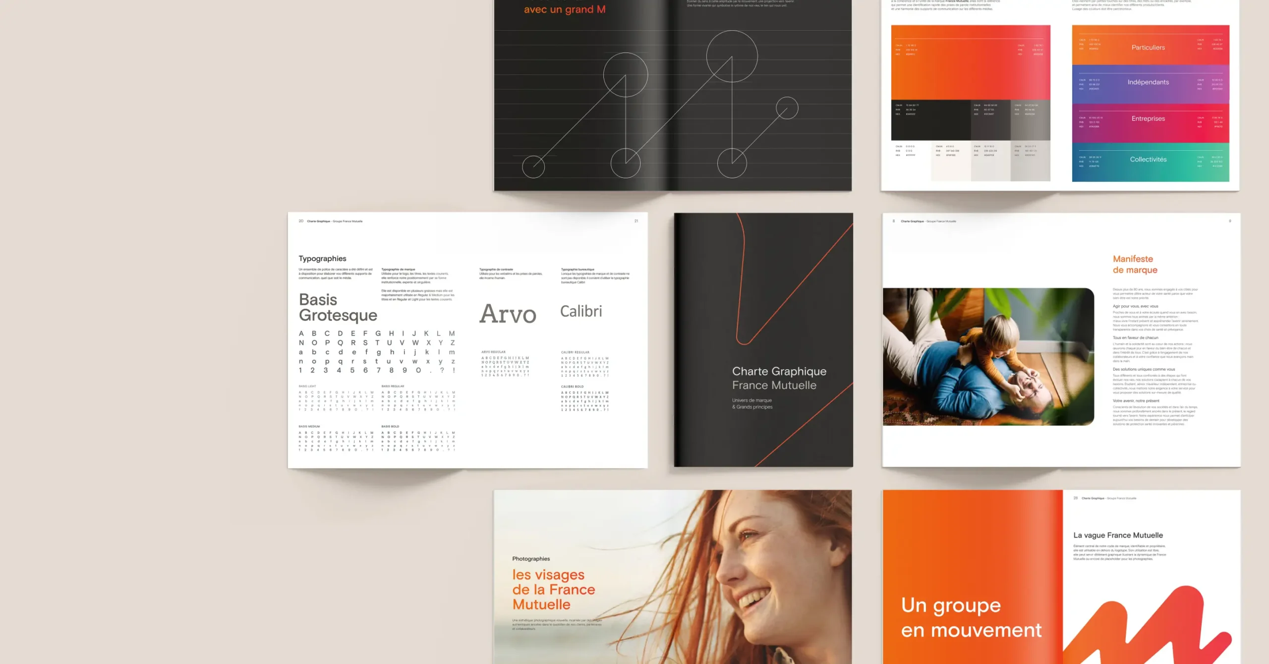 Identité et territoire de marque : une refonte complète incluant logo, couleurs, typographies, manifeste, et iconographie. L’objectif était de créer une identité qui revendique clairement les valeurs de France Mutuelle.