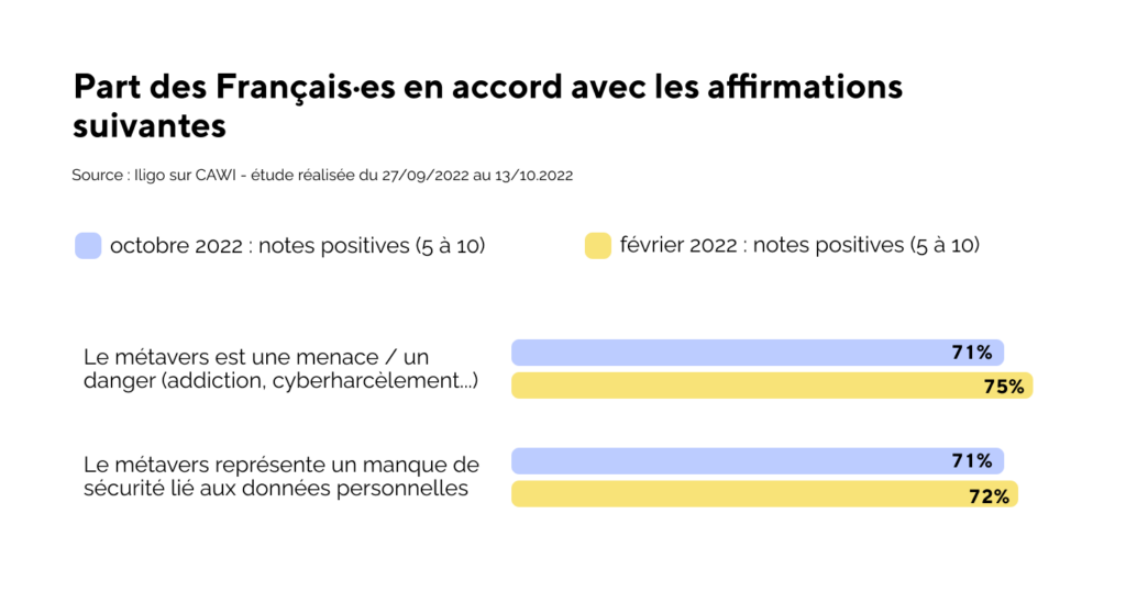 Pour autant, Zuckerberg n’en démord pas et continue ses investissements… quitte à avancer seul pendant encore quelques années. Car si les investisseurs se détournent déjà, du côté des usagers, le marché est encore loin d’être mûr. S’ils sont de plus en plus nombreux·ses à connaître le principe (76% des Français en octobre 2022 vs 56% en février), ils sont encore majoritairement méfiants, notamment en ce qui concerne la sécurité des données personnelles et la menace d’addiction et/ou de cyberharcèlement.