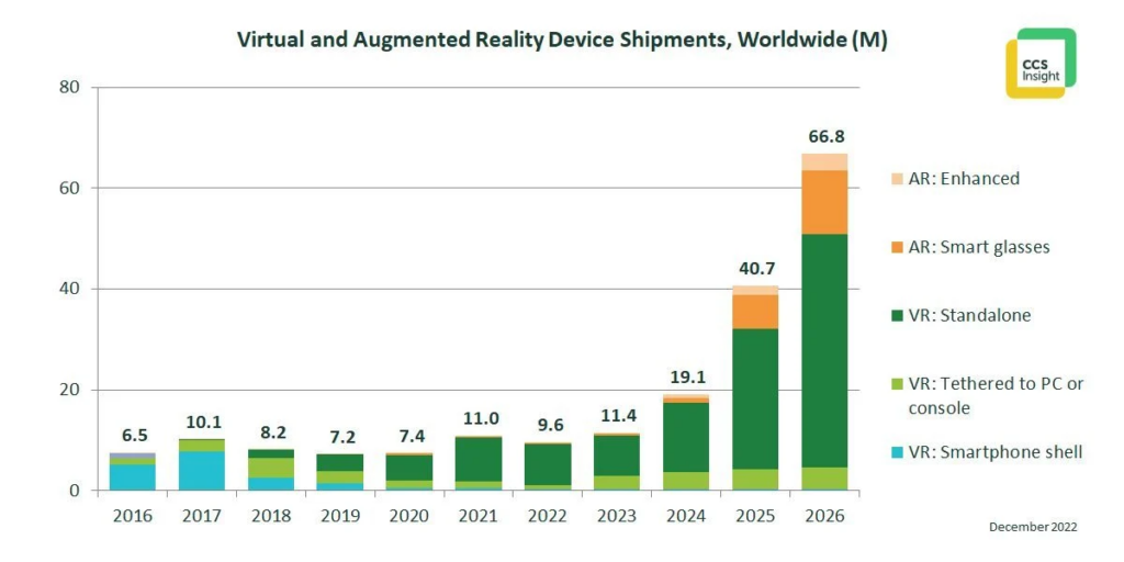 Pour le cabinet, il faudra attendre au moins 2024 pour que les ventes augmentent et voir une adoption des objets liés à la VR et AR. Une adoption qui devrait être portée par le développement des lunettes (moins encombrantes que le casque) et l’arrivée d’acteurs bien établis comme Apple.