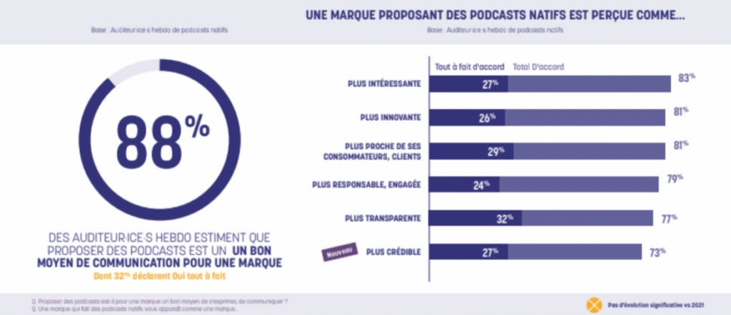 Toutefois, le média reste un jeu qui en vaut largement la chandelle. 88% des auditeur·ices hebdomadaires de podcasts considèrent que le podcast est un bon moyen de communication pour une marque, 83% qu’elle la rend plus intéressante, 81% plus innovante.