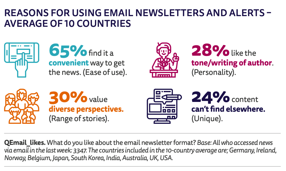 De la même manière que le podcast, la newsletter est souvent décriée. Pourtant, comme nous vous en parlions dans la 162ème édition de Decriiipt, elle a encore de très beaux jours devant elle. Celle qui se meurt, c’est la trash newsletter, ces mails promotions qui polluent notre boite mail et notre planète qui ne nous apportent aucune valeur ajoutée. En comparaison, les newsletters éditorialisées (souvent différenciées sous le nom “infolettre”) se portent plutôt très bien. Selon le Digital News Report 2022 : 17% de la population mondiale utilise ce canal de manière hebdomadaire. Dans les raisons qui poussent à consommer l’infolettre, quatre semblent être cruciales :