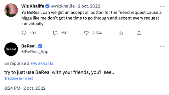 Par ailleurs, les quelques marques ayant, pour le moment, tenté une petite incursion du côté de BeReal (Chipotle, Vrai, e.l.f) se sont très vite heurtées à un certain nombre d’obstacles. Le premier et principal : que produire pour conserver le côté authentique ? Si certains blogs se sont emparés de la question en proposant des formats (ce qu’il faut retenir : montrez des humains – qu’il s’agisse de vos employé·es ou de vos client·es + proposez des codes promos), se pose ensuite la question de la diffusion. Un problème notamment soulevé par Wiz Khalifa, le rappeur qui résume parfaitement la situation :