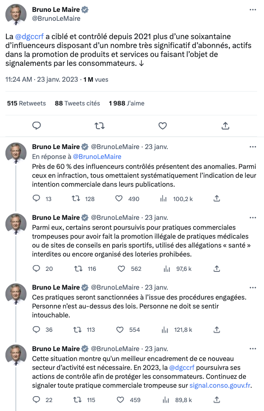 L’année a ainsi commencé avec le communiqué de presse de la Direction générale de la Concurrence, de la Consommation et de la Répression des fraudes (DGCCRF). Elle y annonçait avoir, depuis 2021, mené des enquêtes sur “plus d’une soixantaine d’influenceurs disposant d’un nombre très significatif d’abonnés, actifs dans la promotion de produits et services ou faisant l’objet de signalement par les consommateurs”. Parmi eux, 60% présentaient des anomalies allant de l’omission de l’intention publicitaire à la promotion illégale de pratiques médicales en passant par l’organisation de jeux concours illégaux ou de la mise en avant de sites de conseil en paris sportifs.
