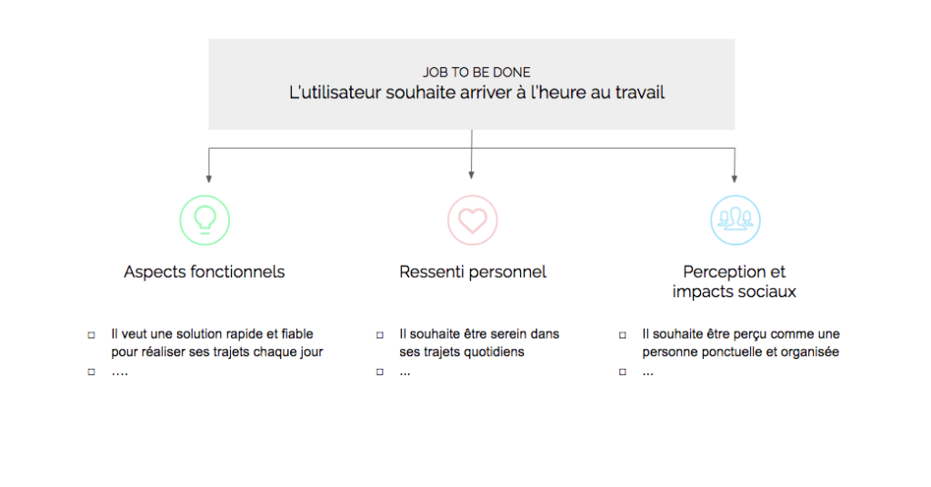 Il n’y a pas de modèle précis de formalisation d’un Job-to-be-done. L’idée est d’exprimer, le plus clairement et objectivement possible, le résultat que l’utilisateur souhaite atteindre, ainsi que les raisons qui l’y amènent.