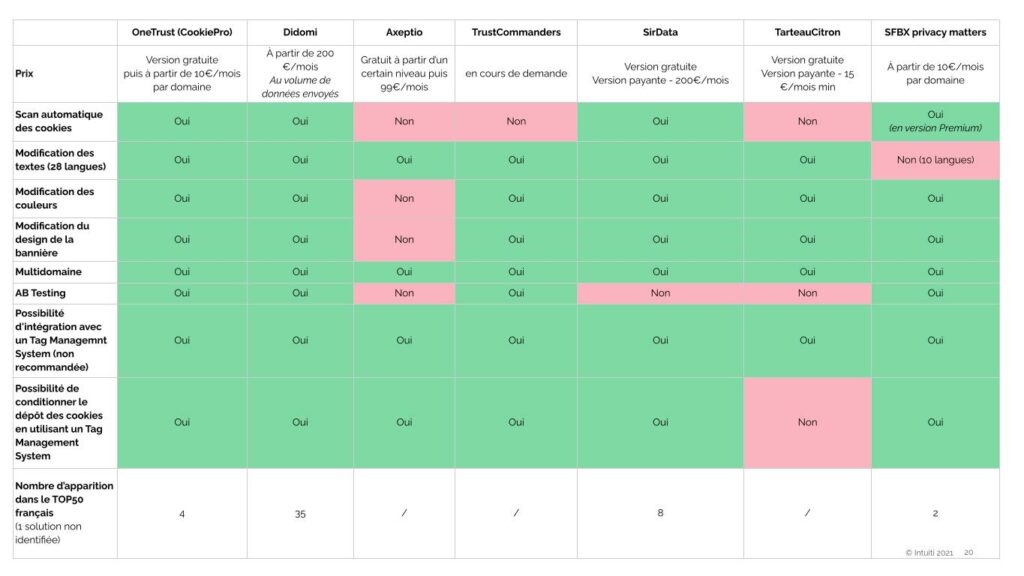 Comme vous pouvez le voir sur le tableau, seuls OneTrust et Didomi cochent nos critères essentiels. Petit tour d’horizon des autres solutions possibles.